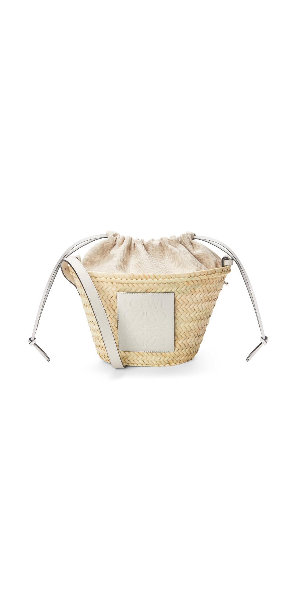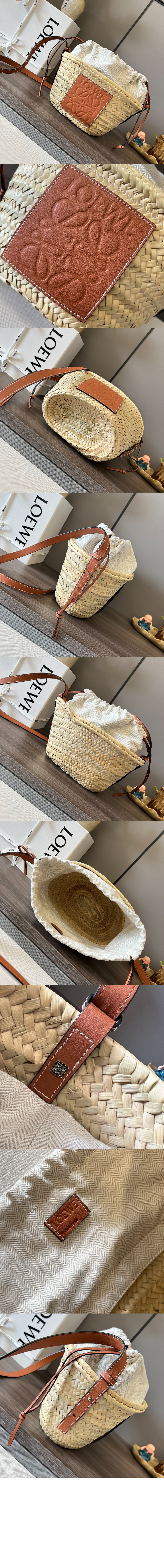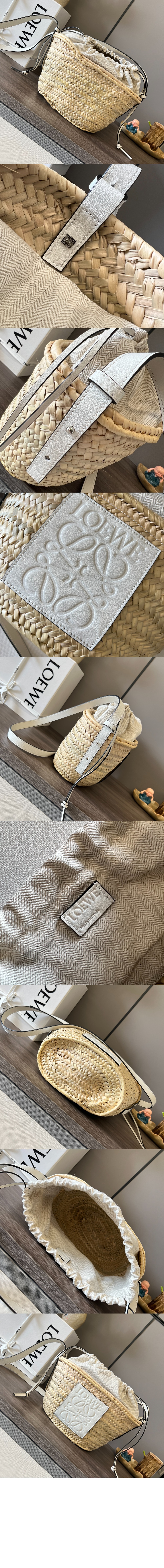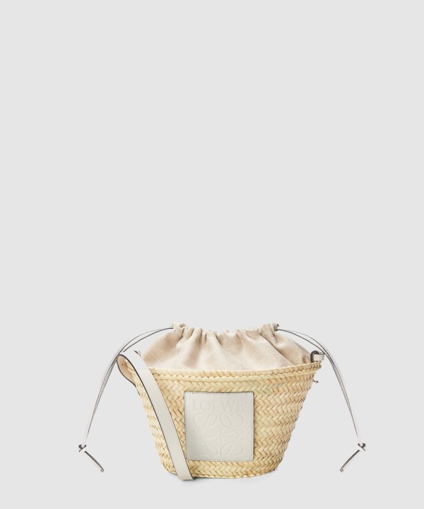 팜 리프와 카프스킨 소재의 드로우스트링 버킷 백
